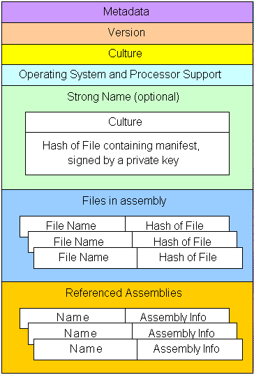 Manifest: In addition to IL and metadata, assemblies themselves are described using metadata called manifest. The manifest contains information about the current version of the assembly, security constraints, locale information, and a list of all externally referenced assemblies that are required for proper execution. The following figure shows the contents of a sample manifest: