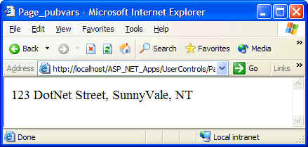 strAddress="123 DotNet Street, SunnyVale, NT"></uc1:UC_pubvars>
