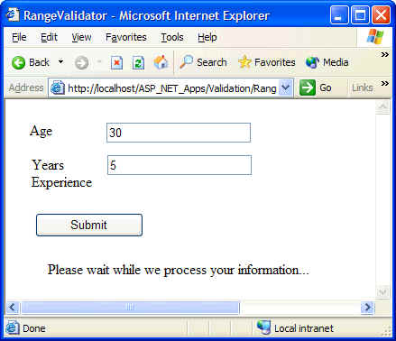 The following two IE screens illustrate the usage of the CompareValidator to check that Age value is an integer and Salary value is > 100,000.