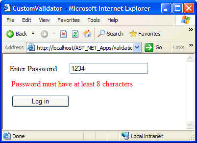 These two tasks can be accomplished using the ServerValidateEventArgs parameters Value and IsValid.,The first property retrieves the value entered into the Web control we wish to validate, and this second property tells the CustomValidator Web control whether validation passes or fails.