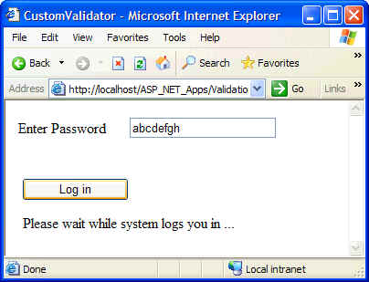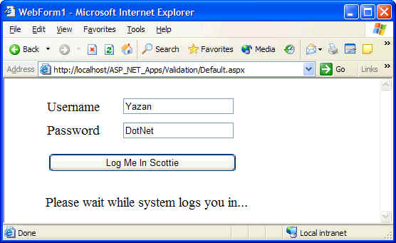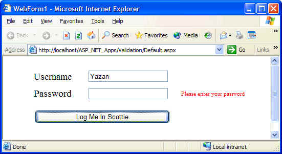 The following figures illustrate what happens when you attempt to log in. ClientTarget="DownLevel" was not present in the @Page directive for this page. Hence, clicking the log in button did not submit the request to the server (Click handler was not called) but instead, caused validation to take place on the client-machine. The second figure shows when validation went through. Clicking the log in button will now send a request to the server.