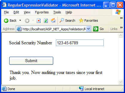 The RegularExpressionValidator, however, is the most flexible and general validation control. As the name implies, RegularExpressionValidator checks a form input field against a developer-defined regular expression (a regular expression is a string with special characters that can be used to lookup specific patterns in another string. Check MSDN for more info). For example, the RegularExpressionValidator is ideal to checking that social security numbers, telephone numbers, email addresses, URLs and many others all meet their particular string format. Therefore, when collecting such information, the RegularExpressionValidator can be very helpful in ensuring that users enter data in the correct format.