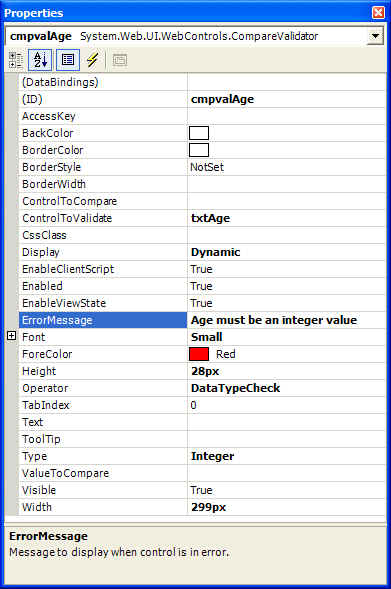 The following two figures show the necessary settings for two CompareValidator controls each associated with a textbox control - one validator validates that entered age value is an integer and the other validates that entered salary value is greater than or equal to 100,000. Of special importance in each of these two Properties pages are the Operator and Type CompareValidator properties. The Operator property tell the validator what kind of compare operation to do (check for value or for type), and the Type operator tells the validator what should the type of data be in the control to be validated: