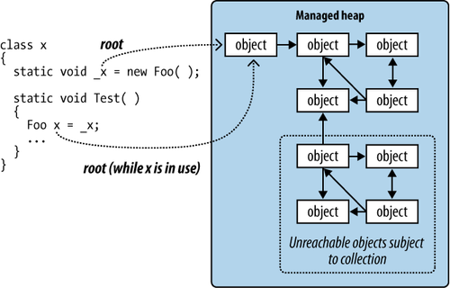If an object is not directly or indirectly referenced by root, it will be eligible for garbage collection. In the following figure, objects that cannot by following the arrows (references) from a root object are unreachable - and subject to garbage collection: