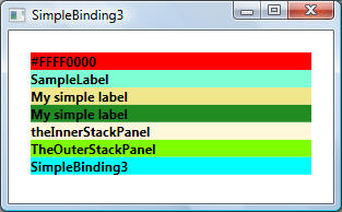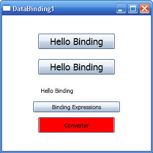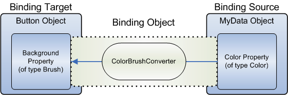 Consider the following example, in which the binding source object is a class named MyData that is defined in the MyNamespace namespace. For demonstration purposes, MyData class has a string property named ColorName, whose value is set to Red. Thus, this example generates a button with a red background: