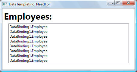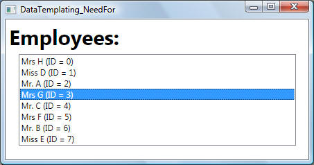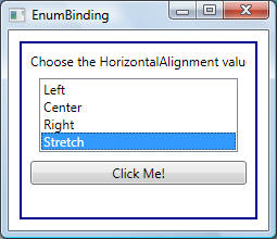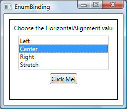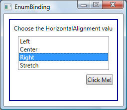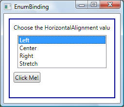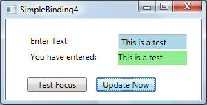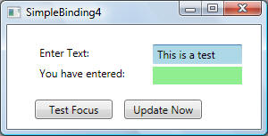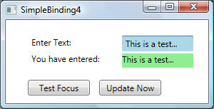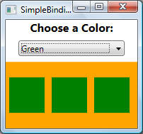 <DockPanel xmlns="http://schemas.microsoft.com/winfx/2006/xaml/presentation" xmlns:x="http://schemas.microsoft.com/winfx/2006/xaml" xmlns:c="MyNamespace"> <DockPanel.Resources> <c:MyData x:Key="myDataSource"/> </DockPanel.Resources> <DockPanel.DataContext> <Binding Source="{StaticResource myDataSource}"/> </DockPanel.DataContext> <Button Background="{Binding Path=ColorName}" Width="150" Height="30"> I am bound to be RED! </Button> </DockPanel>