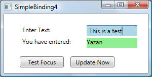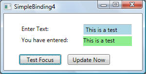 Bindings that are TwoWay or OneWayToSource listen for changes in the target property and propagate them back to the source. This is known as updating the source. example, you may edit the text of a TextBox to change the underlying source value. However, does your source value get updated while you are editing the text or after you finish editing the text and point your mouse away from the TextBox? The UpdateSourceTrigger property of the binding determines what triggers the update of the source.