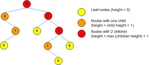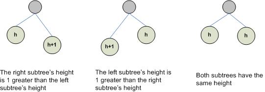 AVL refers to Andelson Velskii Landis, the names of the inventors of this tree. AVL trees must maintain the following balancing property: for every node n, the height of n's left and right subtrees can differ by at most 1. If a node has only one child, then the height of the childless sub-tree is -1. This property is illustrated below: