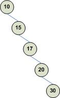 Note that the search time to find a node in a BST depends on the the BST's topology, in other words, how the node are organized with respect to each other. For example, assume we wanted to insert nodes with the following values into a BST: 10, 15, 17, 20, and 30. When 10 is inserted, it is inserted as the root. Next, 15 is inserted as 10's right child. 17 is inserted as 15's right child and so on. The resulting BST is one whose topology is similar to an array:
