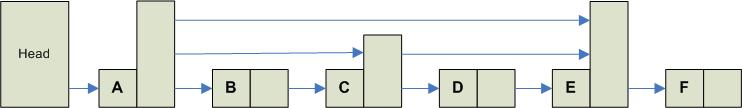A skip list is a linked list made up of a collection of elements. Each element has some data associated with it, a height, and a collection of element references. For example, in the figure above, element C has the data C, a height of 2, and two element references. The head element does not contain any data - it just serves as a starting point whose height should always be equal to the maximum element height in the list.