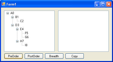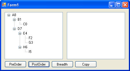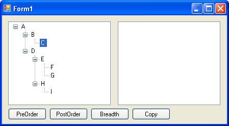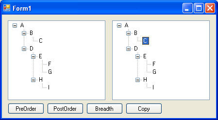 The following example shows how to traverse an already existing tree. The tree is actualy a Windows Forms TreeView whose nodes were added manually. Results are shown after the code: