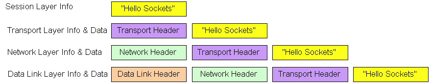 Note how each layer adds information to the data the session layer originally asked to be sent