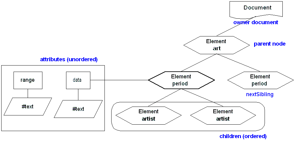 Note that the topmost item in the DOM structure corresponds to the document information item and is of type Document. Note that to access the value of a given node, say <artist>, you must not use the nodeValue property of that element, but rather access the Text node that is the child of that element. The nodeValue of the Text node is the one that contains the character data reflecting the element content.