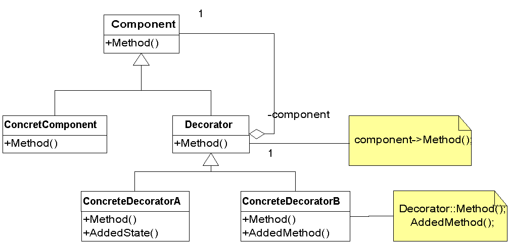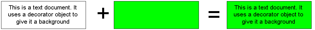 The decorator object encloses the document it wishes to decorate. And since the decorator conforms to the interface of the component (i.e., document) it encloses, clients work with the decorator as if they were working with the document. The decorator is transparent, meaning that clients cannot tell the difference between a decorated object and an undecorated one: When the client calls on the decorator, it forwards requests