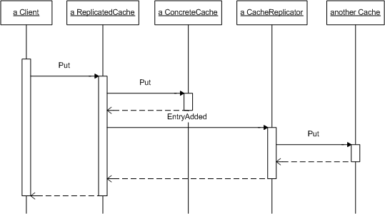 The ReplicatedCache instance delegates the call to its local ConcreteCache implementation. Next, ReplicatedCache notifies each registered CacheReplicator by calling its EntryAdded method. Each CacheReplicator responds by invoking the corresponding operation on another Cache instance.