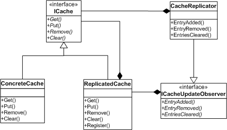 ICache interface is implemented by both ConcreteCache and ReplicatedCache. In this design, ReplicatedCache acts as a Decorator since it implements ICache and delegates all its operations to ConcreteCache. In addition, ReplicatedCache maintains a list of ICacheUpdateObservers that it notifies whenever it delegates a Put or Remove operation. CacheReplicator is a special implementation of ICacheUpdateObserver that updates another Cache instance when a ReplicatedCache notifies it. In other words, CacheReplicator serves as the notification channel from a source cache to a target cache