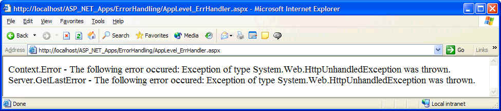 Note in the code above that Context.ClearError() should always be called after the exception has been handled. If the ClearError() has not been cleared, the exception will still show up on the client's browser. The following code illustrates:]