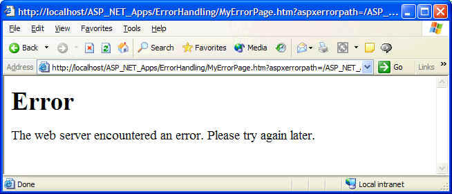In the following screens, the code behind file fired an unhandled exception in the Page_Load function. Because no Error event handler was supplied, ASP.NET will redirect the user to the specified error page. The first screen shot illustrates output if <CustomError> tag in Web.Config was set to RemoteOnly and then accessed locally. The second screen shot illustrates output if <CustomError> tag in Web.Config was set to On and then accessed locally: