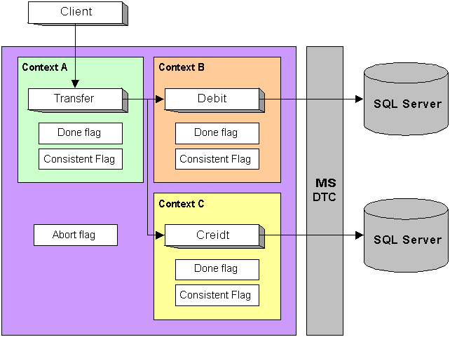 In this example, the outcome of the transaction is determined when the Transfer object is deactivated, and the client' s method call returns. If any of the consistent flags with any context are set to false or if the transaction abort flag is true, the underlying DTC transaction is aborted. Note that the state of the Done and Consistent Flags are changed by SetComplete and SetAbort. The Abort Flag is set to true only if any object is deactivated with its Consistent Flag set to False, i.e., the object called SetAbort then deactivated.