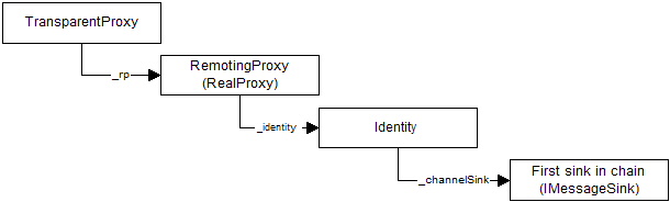 Each sink provider first calls CreateSink() on the next entry in the provider chain and then returns its own sink on top of the sink chain returned from this call. The complete sink chain that is returned from the call to ChannelServices.CreateMessageSink() is then connected to a new TransparentProxy / RealProxy pair's identity object as shown below: