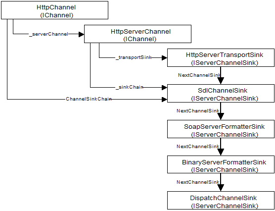 Creating server-side sinks is a little bit different from creating client-side sinks. As shown previously, on the client side the necessary sinks are created when a reference to a remote object is registered. When a server-side channel is created from a definition in a configuration file, the following constructor is used: