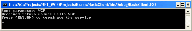 To run this application, start two instances of VS.NET 2005 and open the Basics solution (which contains the three projects mentioned earlier). In one instance of VS.NET set BasicHost as the startup project and press F5. In the other instnace of VS.NET set BasicClient as the startup project and press F5. You can now step through client and server code as you would debug any client-server application. Outputs from both projects are shown below: