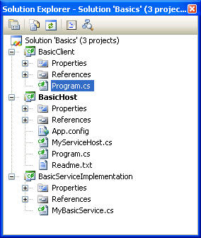 This example is similar to the Example 1 except that SVCUTIL.EXE is used to generate the proxy used by the client. All projects remain the same except for BasicClient.csproj which is now replaced by BasicClientWithProxy.csproj: