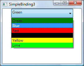 Consider the following example, in which the binding source object is a class named MyData that is defined in the MyNamespace namespace. For demonstration purposes, MyData class has a string property named ColorName, whose value is set to Red. Thus, this example generates a button with a red background:
