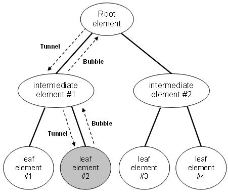Tunneling: Initially, event handlers at the element tree root are invoked. The event then travels a route through successive child elements along the tree node route, towards the node element that is the event source (the element that raised the event). Tunnelling is the same as Bubbling event routing except that the event travels in the opposite direction (starts at the root element and travels down the tree ending with the target element). Tunneling events are also sometimes referred to as Preview events, because of a naming convention that is used for the pairs.