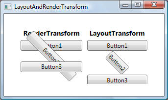 The following example shows the effect of using RenderTransform and LayoutTransform transformation properties:
