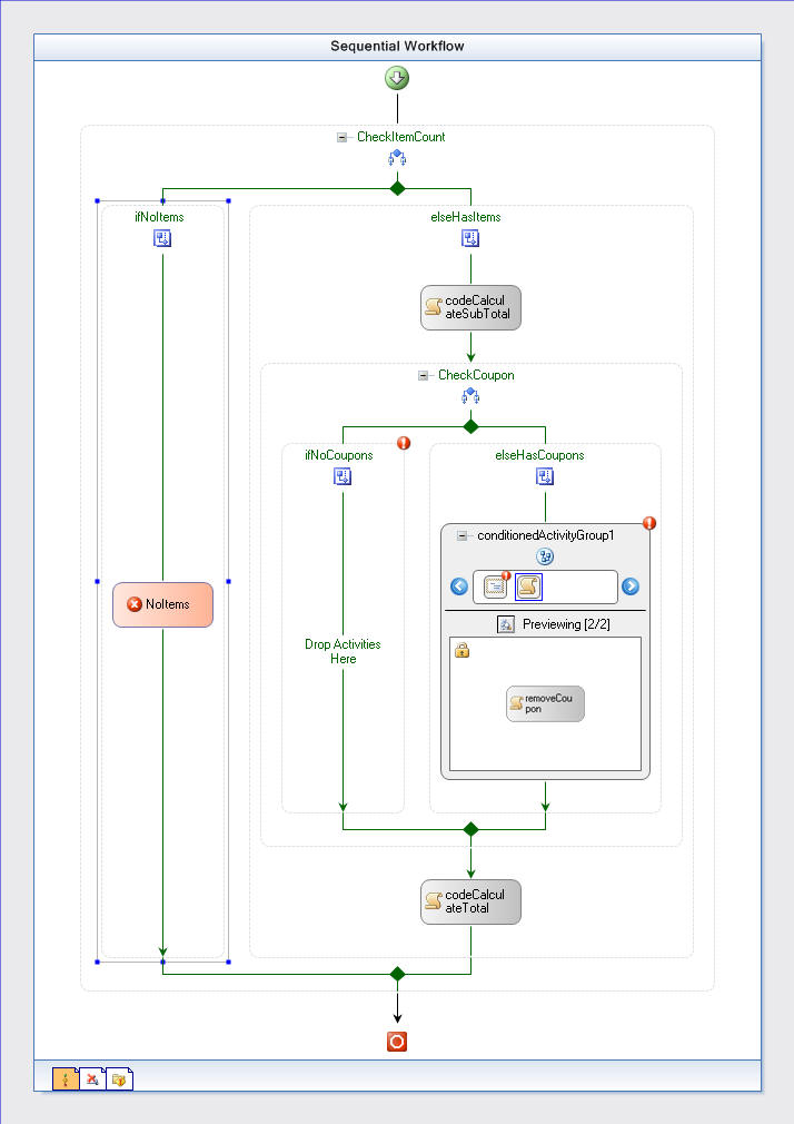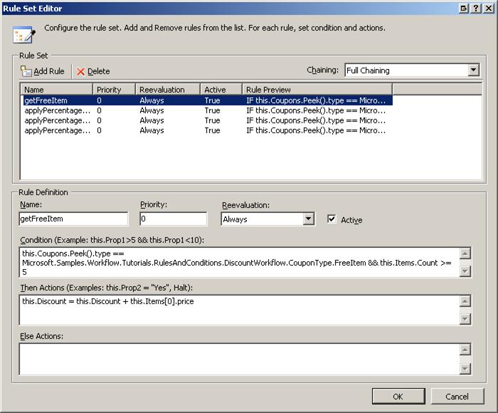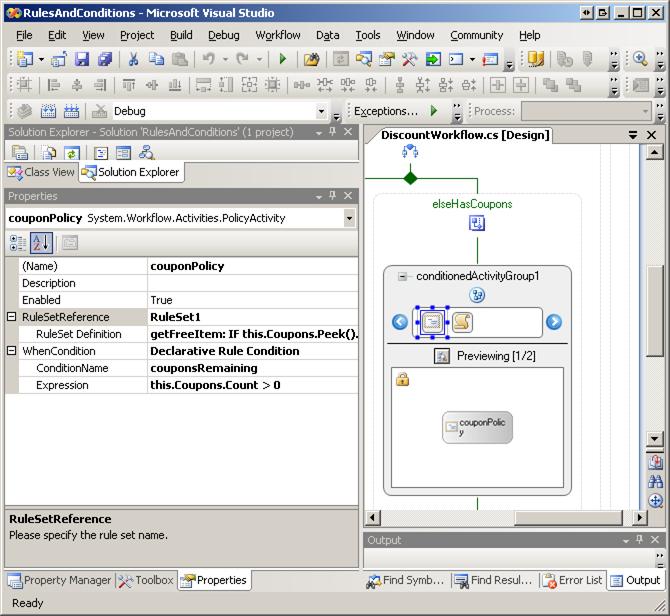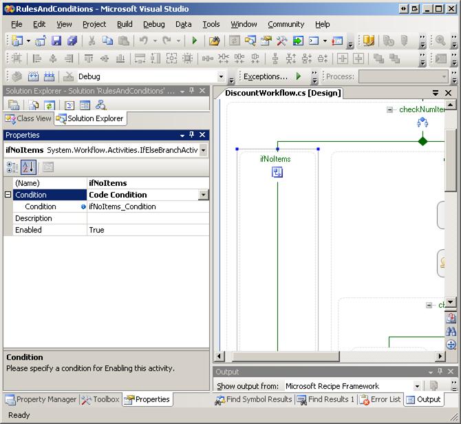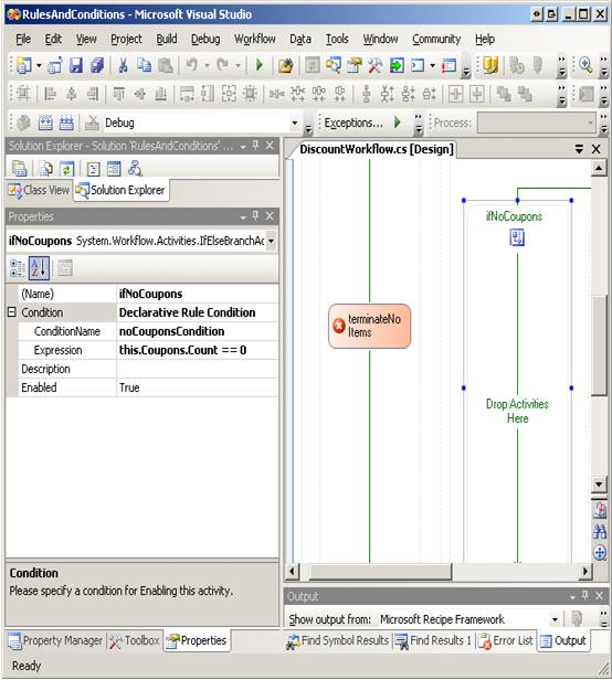 The other approach is to use Declarative Rule Conditions which internally creates a RuleConditionReference instance which points to a RuleCondition definition that is usually specified in a .rules file. Rule conditions can be used instead of code conditions in any activity that supports conditions. The steps are as follows: